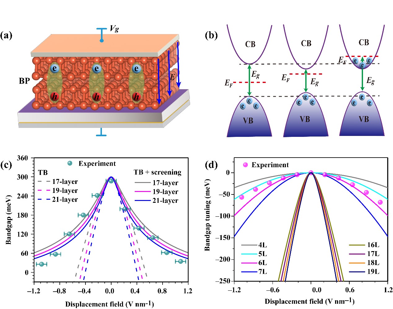 图7. 黑磷的电场工程。(a)黑磷电场工程示意图。(b)电-吸收机制示意图。(c)10nm厚黑磷带隙随电场的变化规律。(d)4nm厚黑磷带隙随电场的演化规律。