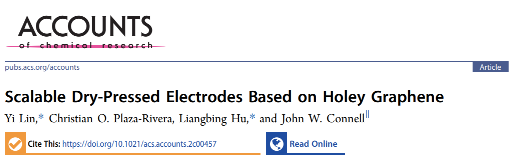 原文详情:Yi Lin*, Christian O. Plaza-Rivera, Liangbing Hu*, and John W. Connell. Scalable Dry-Pressed Electrodes Based on Holey Graphene. Acc. Chem. Res. (2022). https://doi.org/10.1021/acs.accounts.2c00457