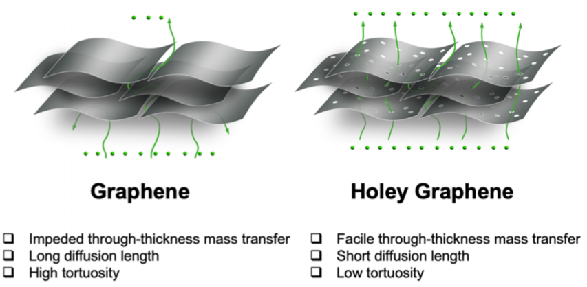多孔石墨烯(hG)是石墨烯的一种结构衍生物。在大多数体相制备方法中,hG片上的孔优先由石墨烯上已有的缺陷产生。因此,hG并不一定比完整的石墨烯更有缺陷。一方面,它保留了石墨烯基本的性质,包括高导电性、高表面积、机械鲁棒性和化学惰性;另一方面,其孔洞结构赋予了hG在未修饰石墨烯中所不具有的独特特性,使其在许多应用中具有优势,如传感、膜和电化学储能等。特别是,孔洞的存在增强了纳米片平面的质量传输,从而显著降低了弯曲度。这一差异是在储能应用中使用hG的一个关键优势,当电极厚度增加以满足实际能量密度要求时,离子通过厚度的传输变得更加阻碍。