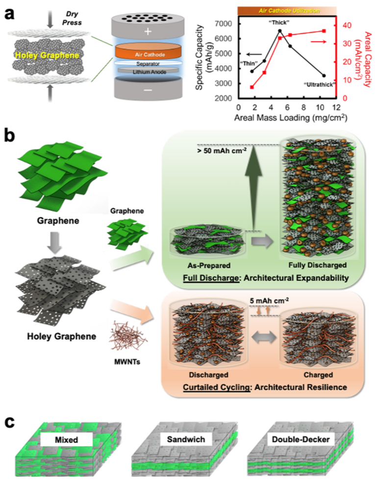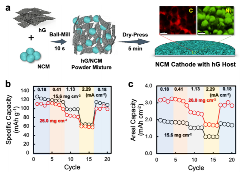 一个意想不到的发现是,hG上的孔可以使干hG粉可以直接被压缩成坚固的整体。hG不仅本身被压成一个整体,而且可以作为可压缩基质容纳其他电化学活性材料。这一重要而独特的特性,是包括完整石墨烯在内的其他碳材料所不具备的,极大地拓宽了储能应用领域。利用干压缩性,可以方便地制备具有超高质量负载和超高面积容量的电极,而不需要传统的浆料基电极制备方法中所涉及的有毒溶剂或粘合剂。干压电极制备过程可以在几分钟内完成,不受质量负载的限制。相比之下,用于先进电池化学材料的高质量负载电极通常需要严格和耗时的过程控制。hG还可以与电化学活性电池材料结合,同时保持干压缩性。这使得对各种厚电极组成和结构的操作变得前所未有的方便,这不仅提供了卓越的性能,而且还为各种电池化学提供了新的物理见解。