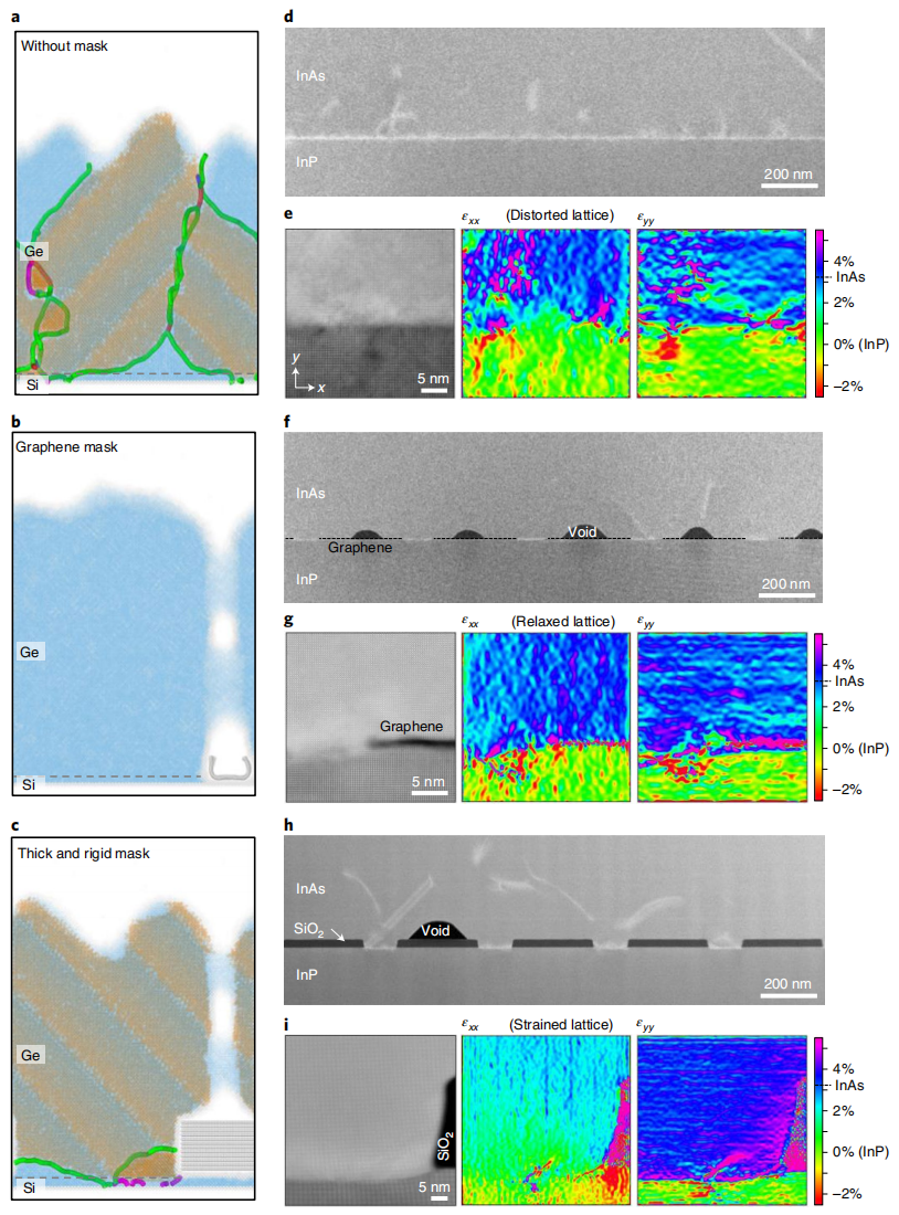 a–c、无石墨烯异质外延的MD模拟(a),薄且柔性的石墨烯掩膜(b)和厚且刚性的掩膜(c)。d,无掩模直接生长在InP上的InAs的低倍STEM图像。e,高分辨率STEM图像(左)和相应的GPA图,显示平面内(中间)和平面外(右)应变。f,生长在石墨烯图案上的InAs的低倍STEM图像。g,石墨烯边缘的高分辨率STEM图像和相应的GPA图,显示了石墨烯轻微变形的弛豫InAs膜。h,I,生长在SiO2图案上的InAs的相同数据组,显示了界面和掩模边缘处的严重应变© 2022 Spring Nature