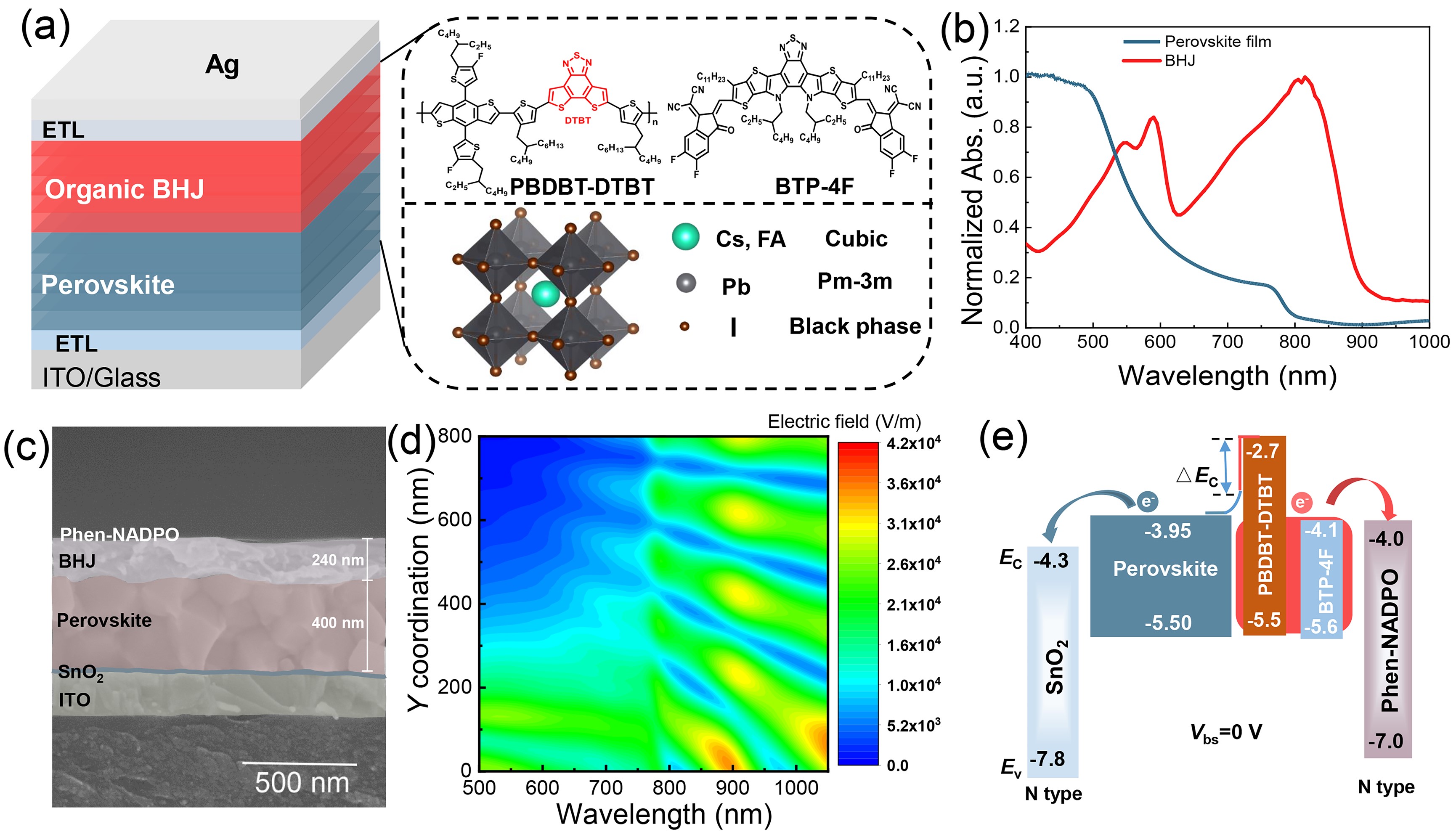 图1 双波段探测器的基本器件结构和薄膜特性。(a) 器件结构示意图(左)、PBDBT-DTBT 和 BTP-4F 的结构式(右上)、钙钛矿的晶体结构和组成(右下)。(b)钙钛矿薄膜和有机 BHJ 的归一化吸收曲线。(c)探测器的横截面SEM 图像(Ag除外)。(d) 探测器的模拟光场分布图。(e) 0 V偏置电压下的薄膜能级示意图。