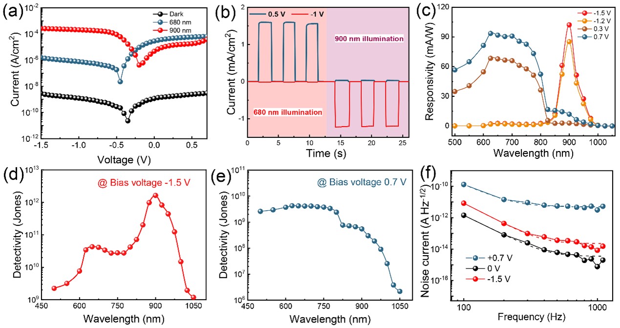 图2 器件的双模响应特性。(a) 在 680 和 900 nm 波长光下的器件的电流-电压(I-V)曲线。 (b) 对于 680 和 900 nm 光源,在 0.5 和 -1 V的偏置电压下测量的 PD 的时间-光电流响应。 (c) 探测器在偏置电压为 -1.5、-1.2、0.3 和 0.7 V时对不同波长光的响应度。(d-e) 探测器在偏置为 0.7 和-1.5 V时的探测度。(f)不同偏置电压条件下探测器的噪声电流。