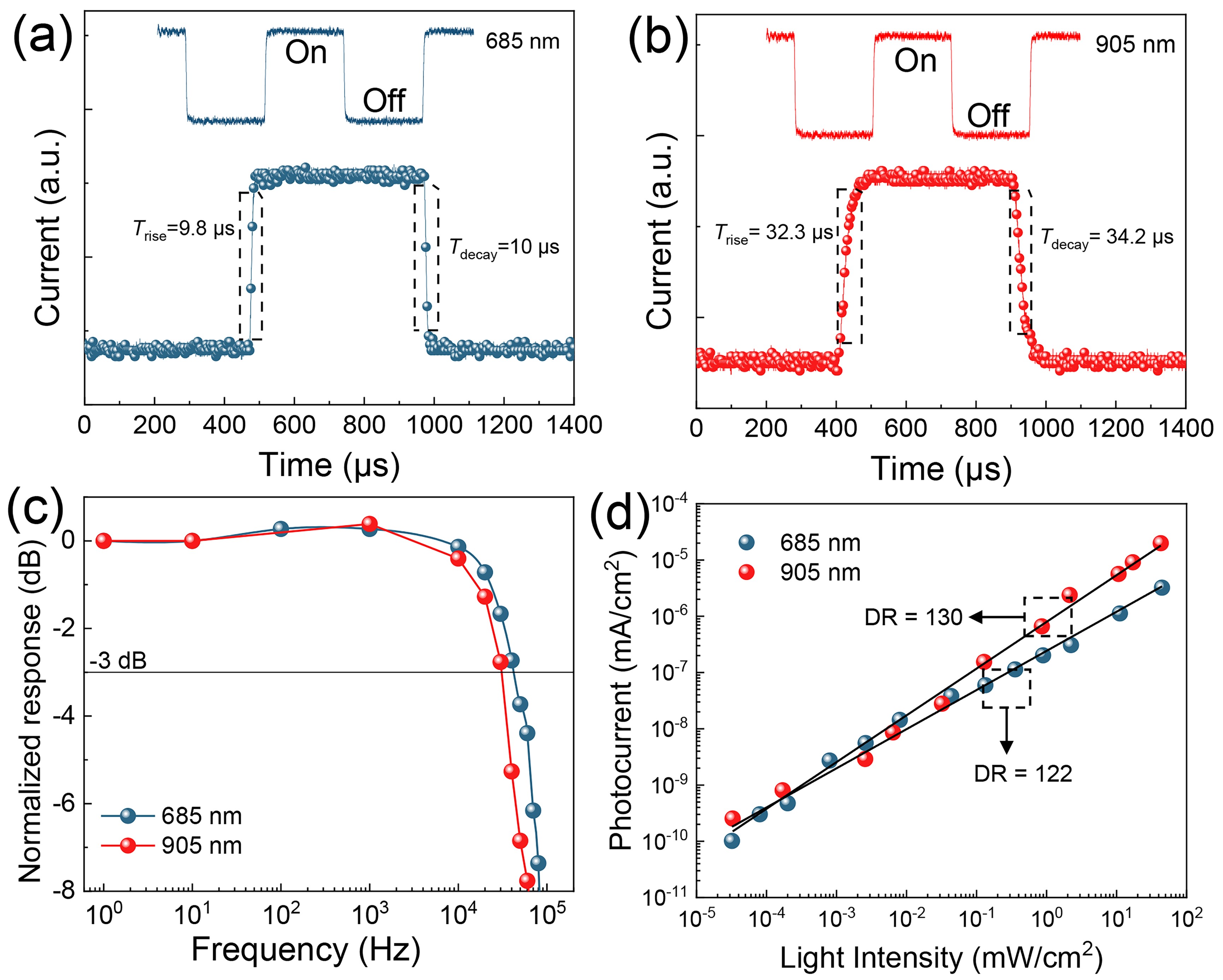 图3探测器在波长为685 nm(a)和905 nm(b)时的响应时间(上升和衰减)(相应的偏置电压分别为0.7和-1.5 V)。(c)可见光和近红外光下探测器在0.7和-1.5 V时的频率响应曲线和(d)动态响应范围。