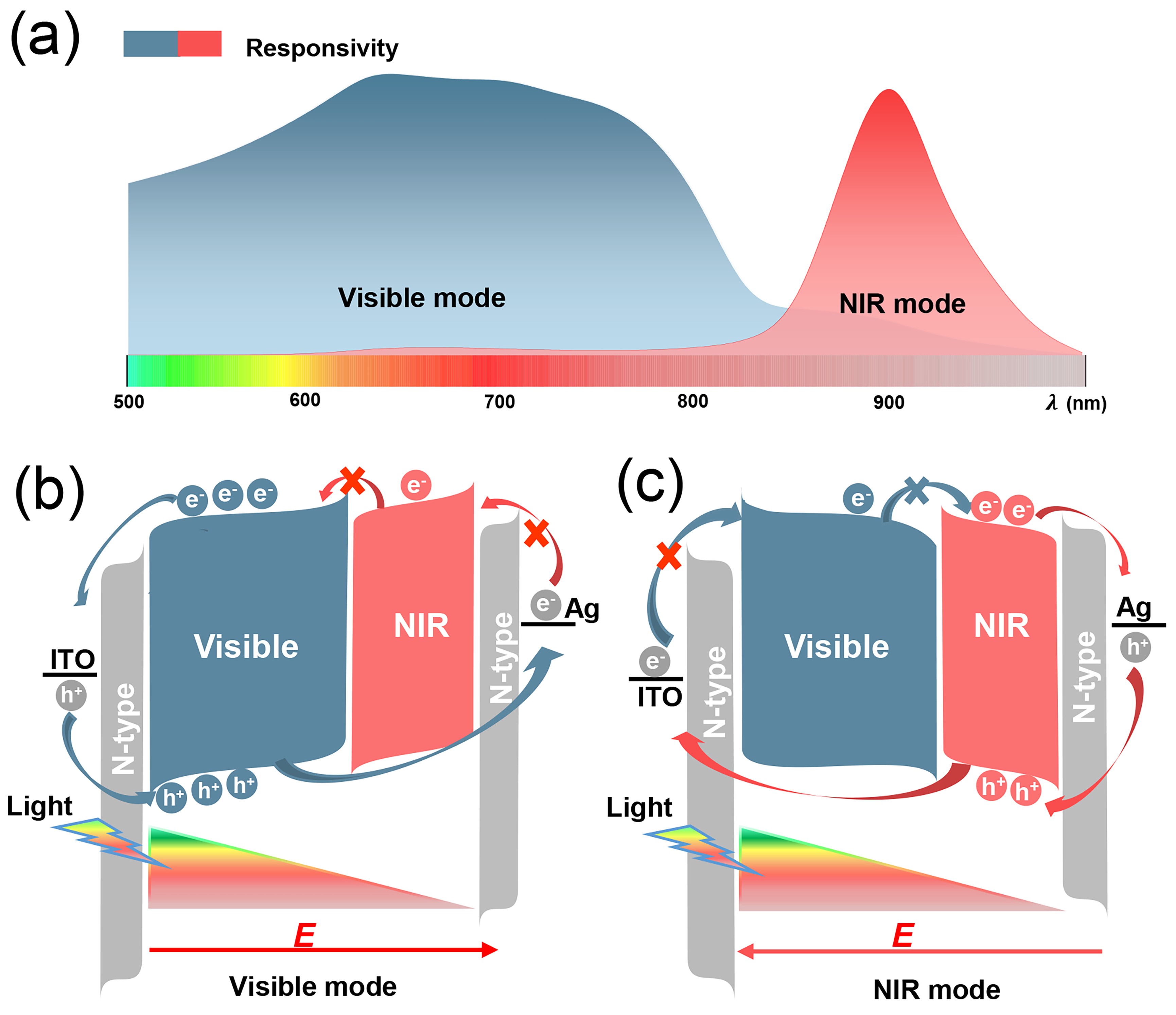 图4 器件物理 (a) 双波段探测器的响应度和光谱的对应图。(b, c) 正向(可见光模式)和反向(近红外模式)偏压的器件的电荷载体传输过程示意图。