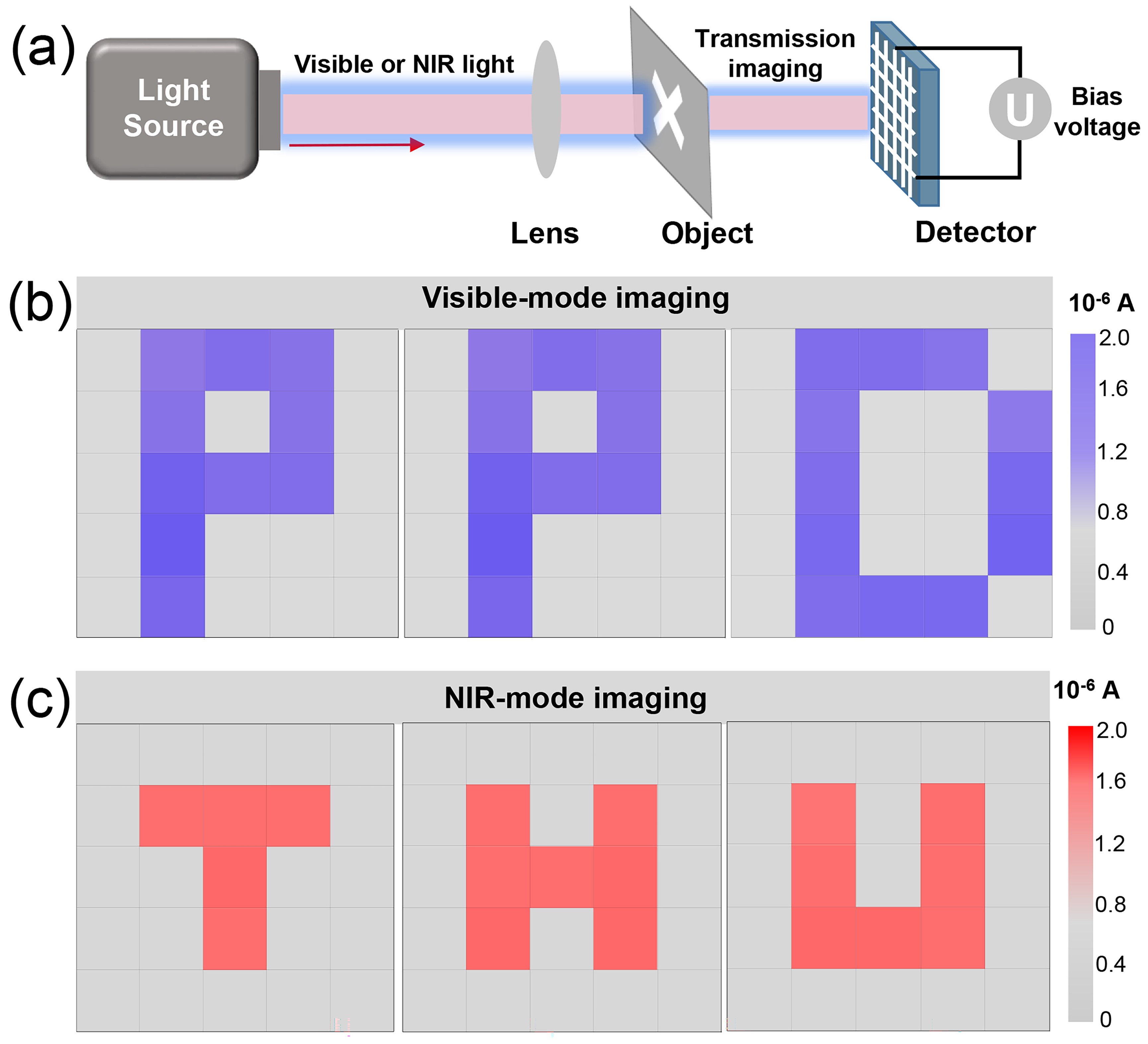 图5 双色成像阵列(a) 图像阵列的工作过程示意图。(b) PD在可见光模式下的成像结果(P、D 掩模板形状)。(c) 近红外模式下PD的成像结果(T、H、U掩模板形状)。