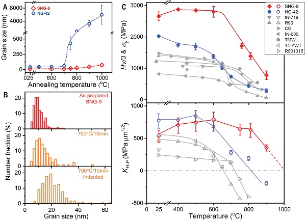 在过去的几十年里,已经开发了各种技术来在纳米结构材料中引入高密度的GBs。通过不同的物理和化学方法稳定GBs已经在广泛的金属和合金中得到证实。本研究结果表明,纳米颗粒合金中稳定的GB网络能够同时提高热稳定性、高温强度和高温抗蠕变性。这样的性能提升与传统的策略有根本的不同。因此,使用稳定的GB网络为设计具有高性能的先进稳定的合金,特别是高温应用的合金,提供了一个可行的范式。