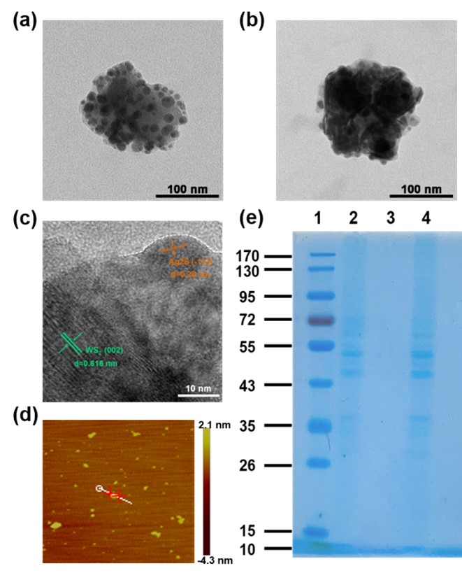 图1 (a) AWS的TEM图,(b) AWS@M的TEM图, (c) AWS的HRTEM图,(d) WS2纳米片的AFM图,(e) SDS-PAGE凝胶电泳(1:marker,2:肿瘤细胞膜, 3:AWS,4:AWS@M)