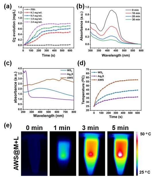 图3 (a) 激光照射下不同浓度AWS的产氧曲线,(b) AWS在激光照射30min时DPBF溶液的紫外可见吸收光谱, (c) Ag2S、WS2和AWS的紫外可见吸收光谱,(d) Ag2S、WS2和AWS溶液在激光照射10 min内的光热升温曲线,(e) 激光照射下不同时间间隔下AWS的红外热像图