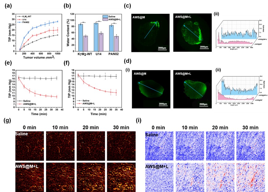 图6 (a)在不同荷瘤小鼠中,TIP水平与肿瘤体积的关系。(b)三种类型荷瘤小鼠经Saline和AWS@M+L处理后肿瘤的含水量(**p < 0.01, ***p < 0.001), (i) AWS@M和AWS@M+L在(c) U14和(d) PAN02肿瘤中的穿透荧光图像,(ii)基于蓝色箭头路径(绿色:香豆素6)的图像J荧光强度分析,(e) U14和(f) PAN02肿瘤经Saline和AWS@+L处理后的TIP水平,(g) Saline和AWS@M+ l处理小鼠U14肿瘤血管在不同时间点的光声图像,(h)不同光照时间下Saline和AWS@M+L组U14肿瘤部位和血管中O2含量的斑点衍射成像。