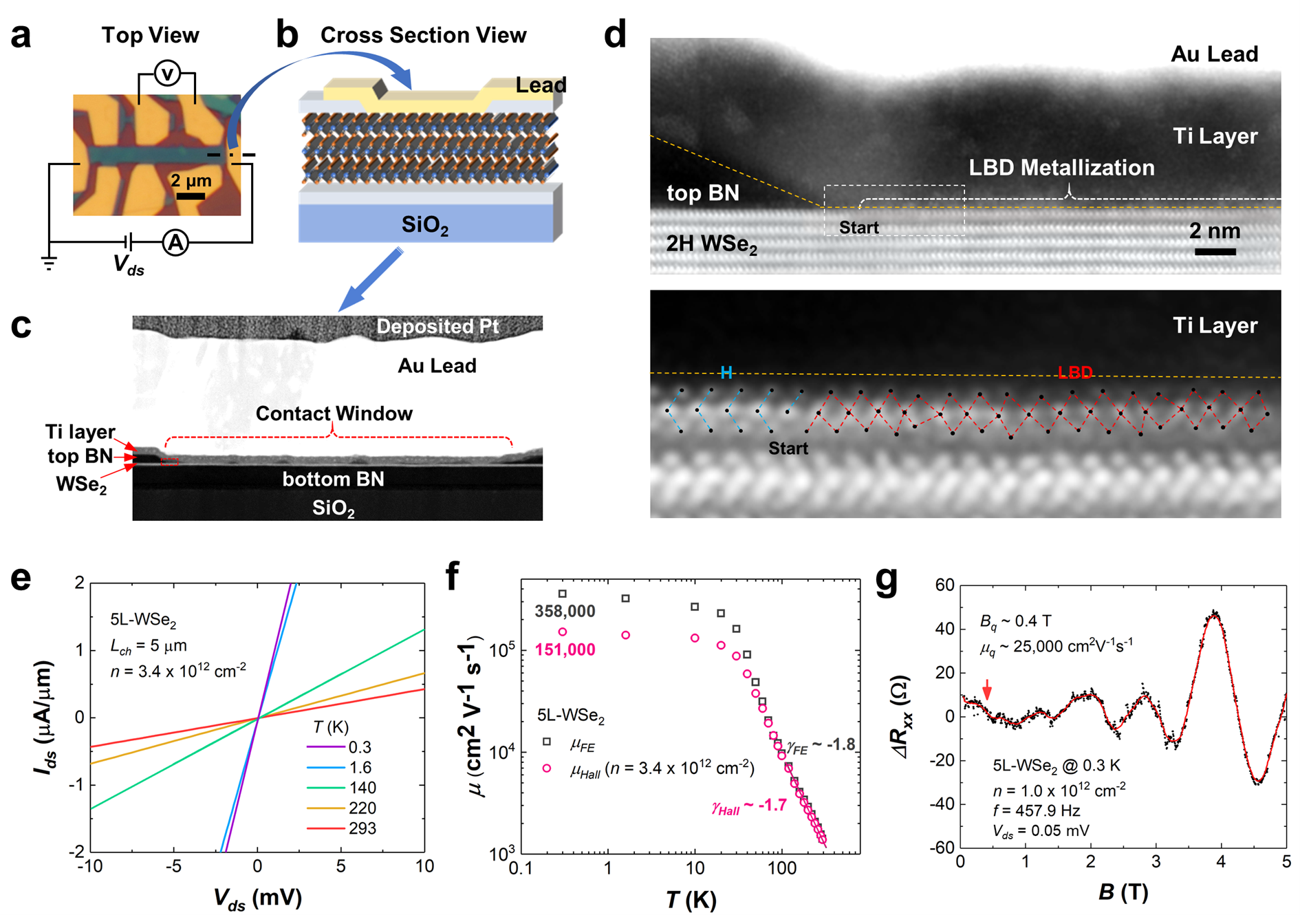 图五:原子层厚WSe2面接触型电界面的结构验证和电学表现。©2022 Springer Nature