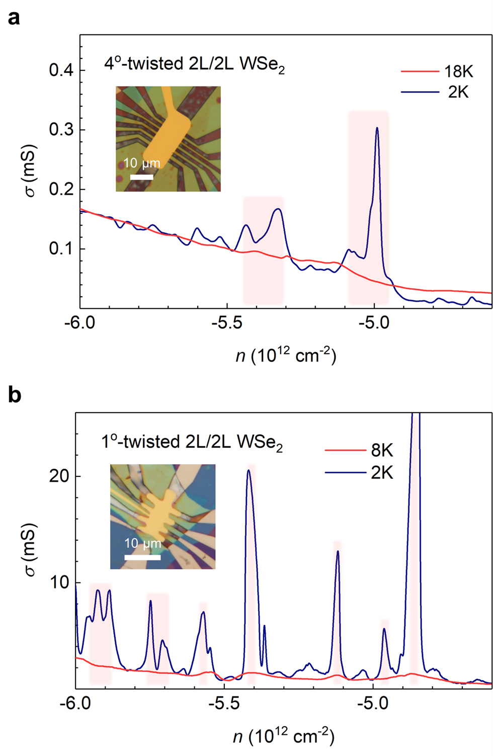 图一展示了“tear-and-stack”干法制备层间旋转角度可控的1L/1L WSe2、以及典型的高角环形暗场STEM图像和对应的选区电子衍射花样。布拉格衍射点周围的高阶卫星斑点佐证了层间界面重构和强层间耦合效应的出现。统计分析特定卫星斑点与所属布拉格衍射点的强度比证实了4度以下随转角减小而指数级增强的界面重构效应,同时2L/2L WSe2由于构成层数增加、层间弛豫抑制力增大,角度依赖程度(卫星斑点出现临界角度和归一化强度/角度变化率)也相应有所提高。相较于倒空间电子衍射的广范围均一化分析,图二从实空间直接探测的方法、系统性地展示了转角摩尔的界面演化规律。随着层间转角逐渐减小,从优势堆叠畴域扩张获得的系统能量降低足以克服界面重构需要的原子位移阻力做功,1L/1L WSe2与2L/2L WSe2呈现出截然不同的界面重构图案(分别为镜面对称三角和近似笼目结构的周期重复畴域花样)和局域化的原子堆垛结构。需要注意的是,两者虽然遵循相同的摩尔周期波长规律,但层间堆垛的高度局域化打破了传统的摩尔结构、层内弹性形变使层内剪切应力累积到了3-4纳米的畴界内,从而显示出奇偶层数依赖的不同应力网络分布(如图三所示)。这种空间限域的应力网络使得摩尔平带分裂成多个窄带宽的迷你平带,体现为随载流子浓度增加而不断涌现的导电态。而在大转角样品中,简单的连续刚体模型仍然有效,只有单一的摩尔平带出现(如图四所示)。
