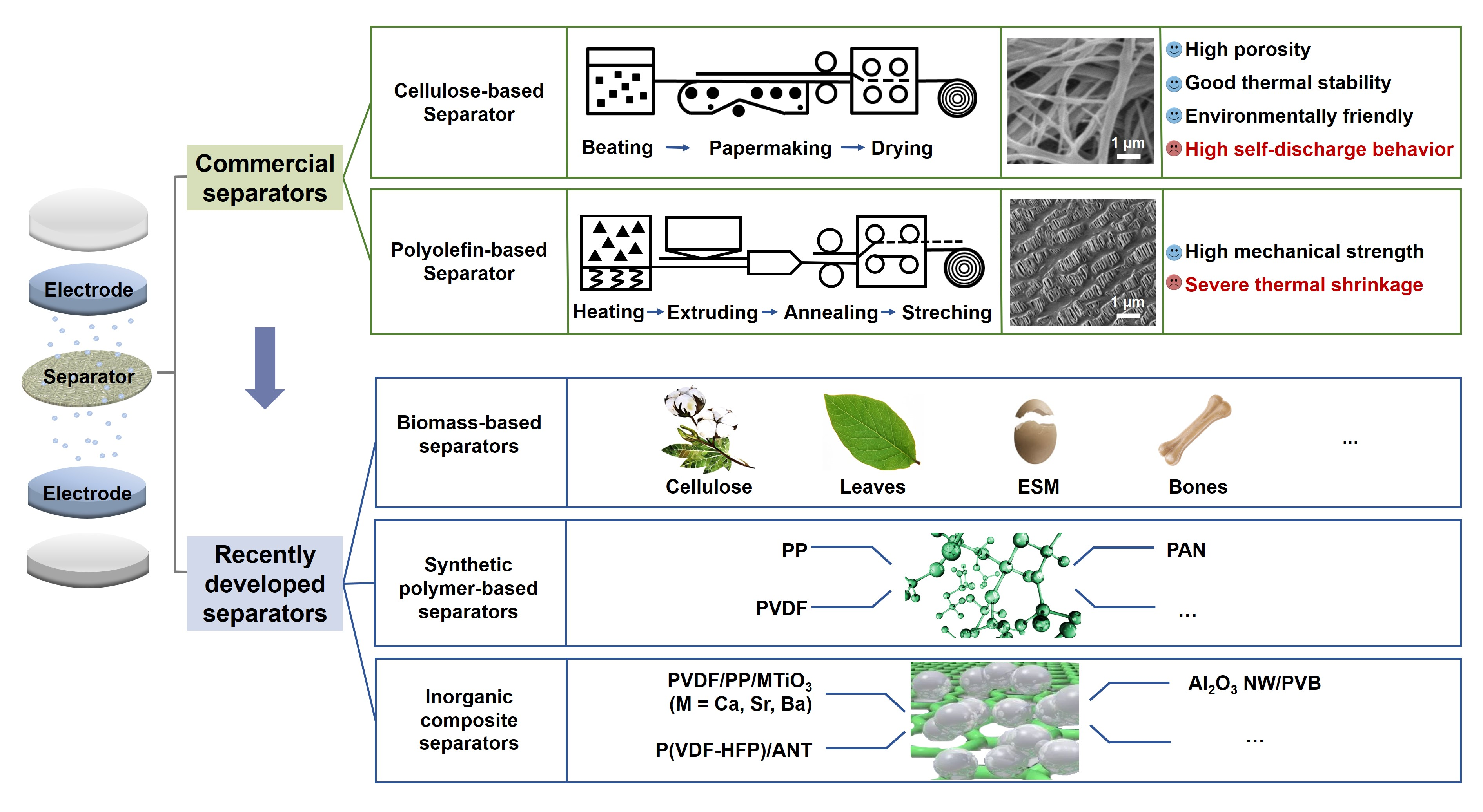 本文综述了超级电容器隔膜的最新研究进展。根据原材料的类型,可将其分为三类,包括生物质基隔膜、合成聚合物基隔膜和无机复合隔膜。此外,还详细讨论了这些类型的隔膜在改善超级电容器性能方面的最新进展,为不同应用场景下选择最适合的隔膜提供了有用指导。