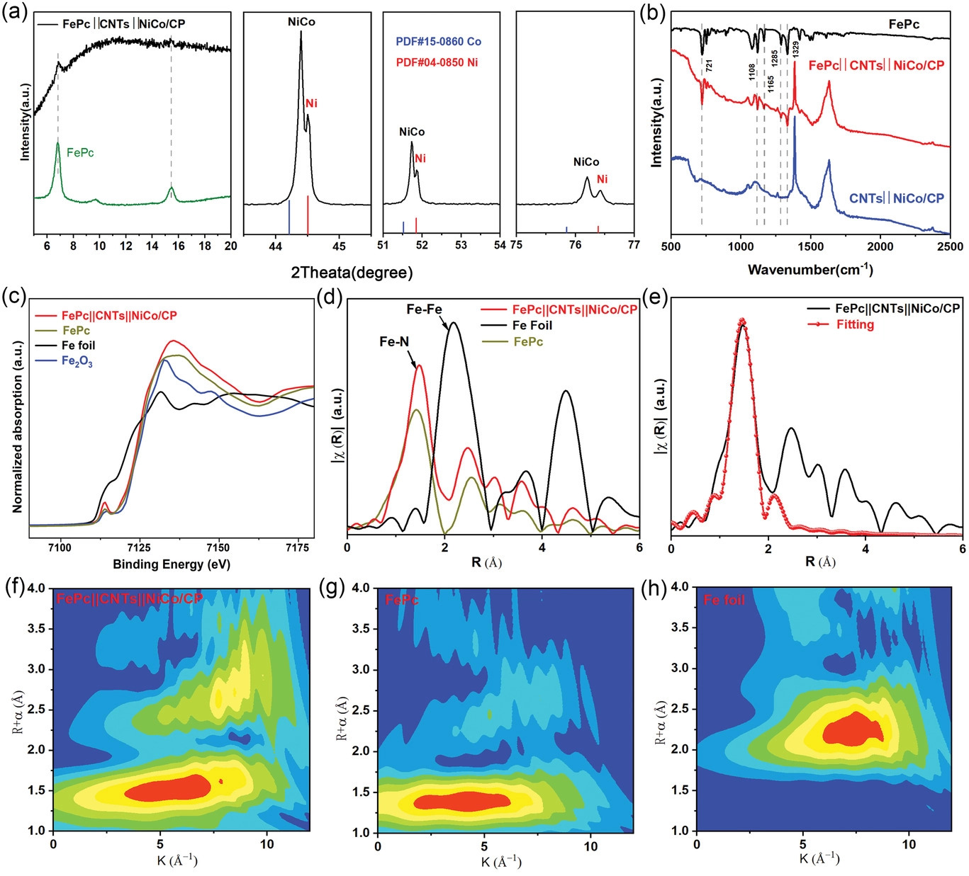 图1:a)FePc ||CNTs||NiCo/CP的XRD图谱。 b)FePc ||CNTs||NiCo/CP和参考样品的FTIR光谱。c)FePc ||CNTs||NiCo/CP和参考样品的Fe K-edge XANES光谱。d)FePc ||CNTs||NiCo/CP和参考样品的FT k3加权EXAFS光谱。e) NiCo/CP||FePc /CNT的FT-EXAFS拟合曲线。f)FePc||CNTs||NiCo/CP,g)FePc和h)Fe箔的小波变换(WT)。©2022 Jin-Cheng Li
