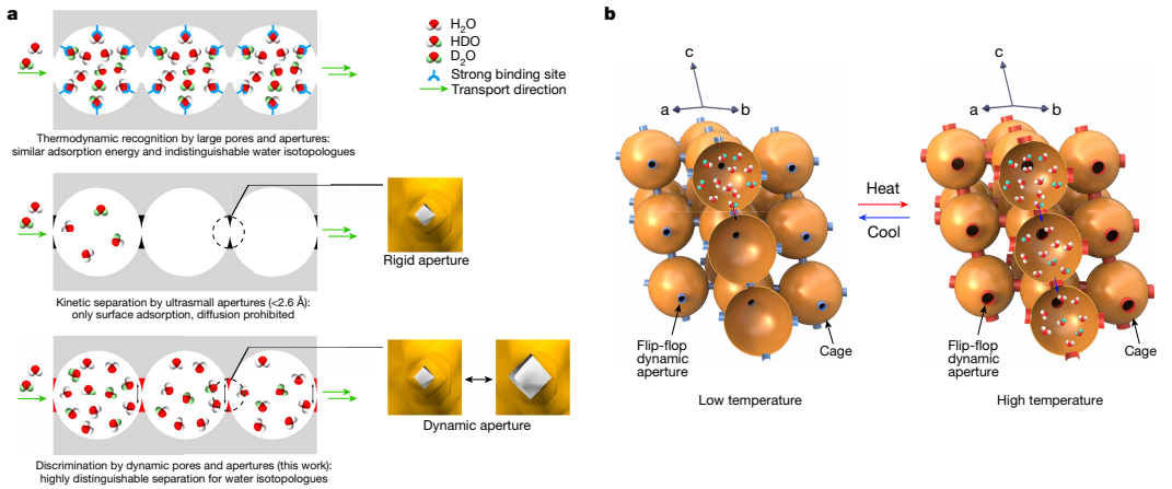 同位素无论是在基础研究还是工业化应用方面都有重要的作用。化学家试图利用基于分子化学的简单方法来分离同位素,例如通过电解使水同位素的键解离或使用笼状化合物或刚性多孔材料等宿主材料来捕获其中一种同位素。然而,由于同位素分子内结构和分子间相互作用的内在相似性,分离同位素一直是十分困难的。水同位素在生物过程、工业、医疗等方面非常重要,是最难分离的同位素对之一。因为它们的物理化学性质非常相似,导致传统蒸馏和电解方法分离H2O(普通水)和D2O(重水)的存在巨大阻碍。因此,用Geib-Spevack法等基于热力学平衡下质子交换的方法很难分离水同位素。此外,H2O和D2O的动力学直径非常小,且完全相同,这使得使用多孔基质的吸附分离相当困难。