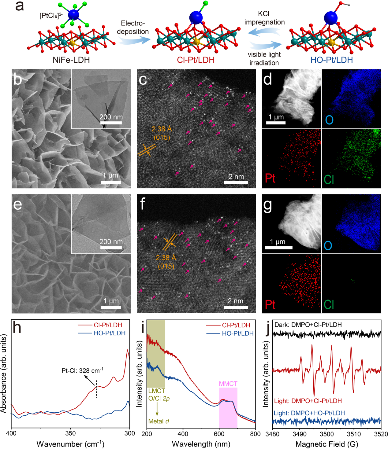 图1a阐述了调整Pt/LDH的轴向配体的辐照-浸渍过程。扫描电子显微镜(SEM)和透射电子显微镜(TEM)图像显示,原始的NiFe-LDH和Pt-负载的LDH都表现出板状的纳米片阵列(图1b,e)。通过像差校正的高角度环形暗场扫描透射电子显微镜(AC-HAADF-STEM,图1c)没有检测到亚纳米级的团块或纳米颗粒,证实了Cl-Pt/LDH中铂原子呈原子分散。为了交换Cl配体,作者在KOH中用白光照射处理Cl-Pt/LDH。可以发现照射后铂原子的原子分散度保持不变(图1f),但Cl信号的强度大多减弱,这表明Cl配体被成功去除。在Cl-Pt/LDH和HO-Pt/LDH的紫外可见漫反射光谱(UV-vis DRS)中,配体对金属电荷转移(LMCT)引起的吸收带有明显的变化(图1i),而金属对金属电荷转移(MMCT)保持不变,表明在辐照后只发生了配体交换。图1j所示,将Cl-Pt/LDH暴露于光和DMPO自发地出现了明显的自由基信号,这可以归因于光产生的空穴将Cl配体氧化为Cl自由基,然后被DMPO捕获,形成DMPO+●自由基。相反,在黑暗中的Cl-Pt/LDH和在照明下的HO-Pt/LDH的样品没有观察到自由基信号,这和预期结果相同。综上,作者得出结论,Cl–到OH–配体的交换是由可见光照射诱导的当HO-Pt/LDH样品被重新浸入KCl溶液中,-Cl轴配体可以被恢复(表示为R-Cl-Pt/LDH)。