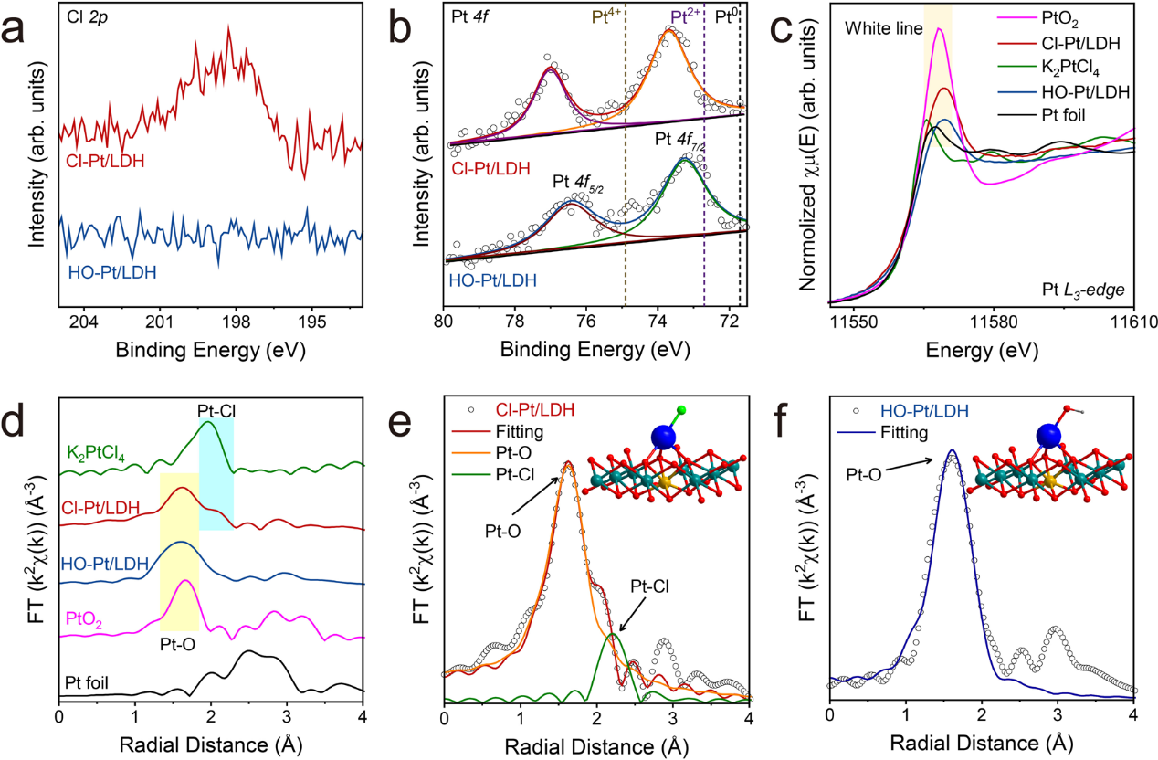 X射线光电子能谱(XPS)发现光照射后Cl 2p信号消失(图2a),进一步证明了配体的完全交换。如图2b所示,Cl-Pt/LDH和HO-Pt/LDH中铂原子的4f7/2峰都位于Pt2+和Pt4+之间。通过X射线吸收精细结构(XAFS)光谱分析Cl-Pt/LDH和HO-Pt/LDH中铂的配位环境和电子结构。首先,分析了上述样品和Pt箔、K2PtCl4和PtO2在Pt L3边的参考X射线吸收近边结构(XANES)光谱。如图2c所示,Cl-Pt/LDH和HO-Pt/LDH的白线都位于K2PtCl4(Pt2+)和PtO2(Pt4+)之间,表明Cl-Pt/LDH和HO-Pt/LDH中铂原子的价态在+2和+4之间,与XPS结果一致。通过傅里叶变换(FT)扩展X射线吸收精细结构(EXAFS)光谱进一步分析Pt-SACs的配位环境。如图2d所示,在Cl-Pt/LDH中发现了两个明显的峰值,分别在1.60埃和2.06埃左右,这与PtO2中的Pt-O路径和K2PtCl4中的Pt-Cl键有关。而在HO-Pt/LDH中只能看到一个~1.60埃的Pt-O样峰,表明Cl配体在辐照后被完全取代。为了揭示Pt单原子位点的化学环境,作者对Pt-SACs进行了定量的最小平方EXAFS曲线拟合分析,提出了Cl-Pt/LDH最可能的结构如图2e的插图所示。