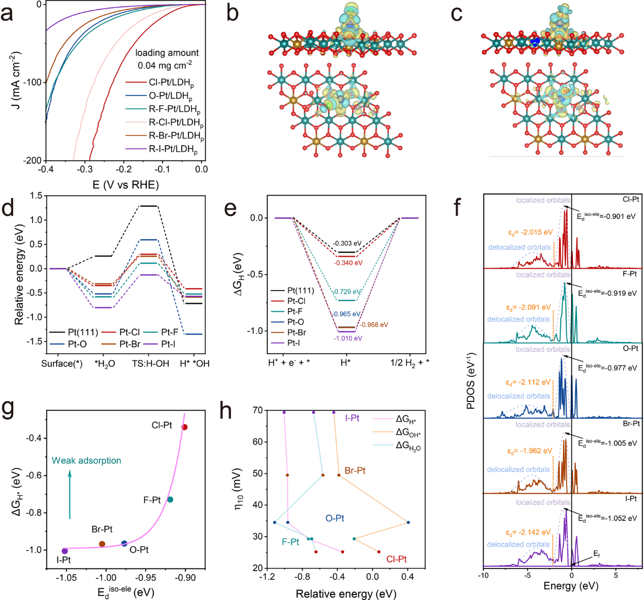 作者通过相同的辐照-浸渍方法扩展了其他轴向配体,制备了R-F-Pt/LDH、R-Br-Pt/LDH和R-I-Pt/LDH。图4a可以观测出具有不同轴向配体的Pt-SACs的碱性HER活性与卤素原子的第一电子亲和力成比例。作者通过第一性原理模拟探究这种轴向配体效应的物理规律。X-Pt/LDH(X=-F,-Cl,-Br,-I和-OH)的计算模型是根据EXAFS拟合结果建立的。如图4b,c和所示,在Pt-X键区观察到明显的电荷重新分布,这可能是增强的HER活性的来源。对Pt-SACs上碱性HER的分步反应势垒进行建模。对于Volmer步骤(图4d),所有卤素配位的Pt/LDHs比Pt(111)上的显示出更强的H2O吸附能力和更大的水解焓的形成,导致Volmer步骤加速。其中,Cl-Pt/LDH在Volmer步骤中表现出最小的势垒(0.073 eV)。另一方面,在Pt-SACs中,Cl-Pt位点也表现出最优化的H结合能(图4e)。综合结果表明,H结合能不是碱性HER的唯一描述符,OH结合能也起着重要作用。总的来说,计算结果与实验观察相吻合,表明用轴向配体修改Pt-single-sites的电子结构是调整HER活性的一个有效策略。综合来看,X-Pt/SACs的碱性HER活性随着配体的第一电子亲和力单调增加(图4h)。