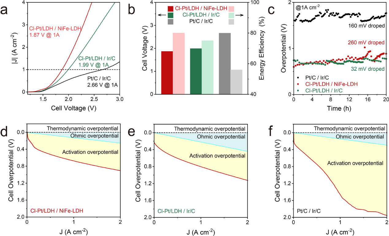 为了评估Cl-Pt/LDH作为阴极催化剂在实际条件下的适用性,作者以原始的NiFe-LDH为阳极,构建了一个基于阴离子交换膜的膜电极组件(MEA)电解器。在60℃下获得了电流-电压曲线(图5a)。在没有进一步优化的情况下,基于Cl-Pt/LDH/NiFe-LDH的电解池在电流密度为1.0 A cm-2时,表现出比基于Cl-Pt/LDH/Ir/C(1.99 V)和Pt/C/Ir/C(2.66 V)的电解池低很多的电池电压(1.87 V)。对应的能量转换效率分别为80%、75%和56%(图5b)。如图5c所示,Cl-Pt/LDH/Ir/C电解器表现出良好的稳定性,显示出未来实施绿色制氢的良好潜力。如图5d-f所示,很明显,Cl-Pt/LDH/NiFe-LDH或Cl-Pt/LDH/Ir/C的活化过电位比Pt/C/Ir/C低得多,这说明Cl-Pt/LDH具有优越的HER活性。