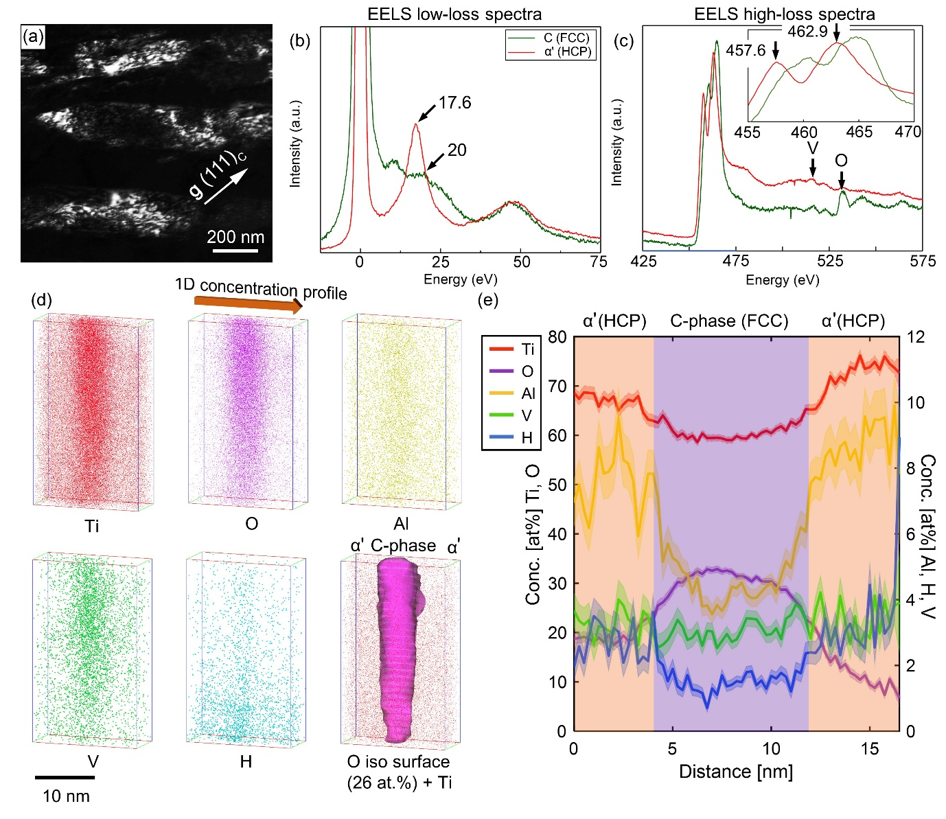 d -e) 两相区原子探针层析,发现C相有30 at.%的氧元素富集。