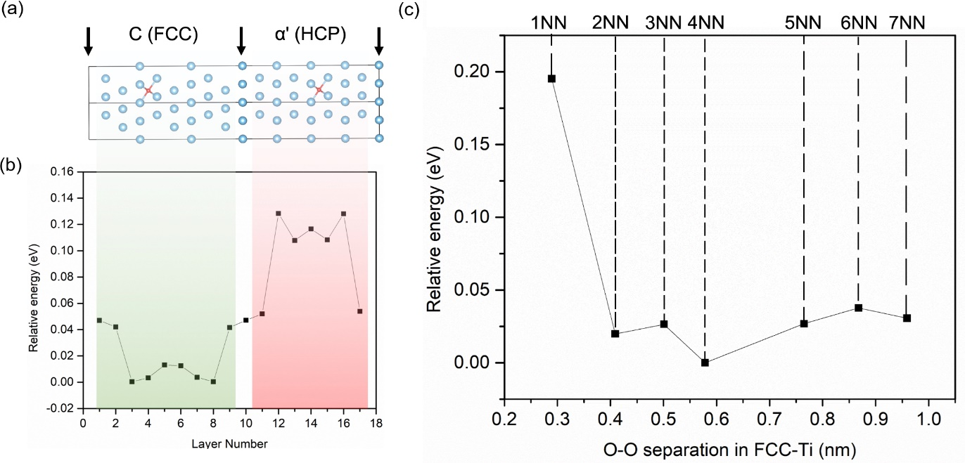 c) DFT结果指出O原子之间第一近邻能级态最高,证明了O元素在C相中是固溶强化的作用,而不是TiO金属互化物。