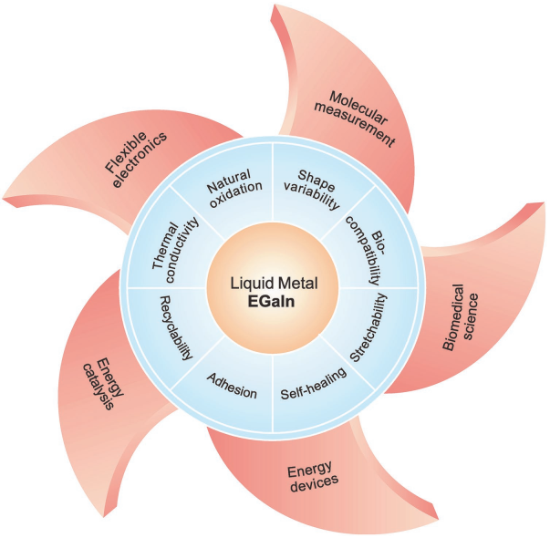 共晶镓铟合金(EGaIn)是一种熔点接近或低于室温的液态金属,因其具有流动性、高导电性、导热性、可拉伸性、自愈合能力、生物相容性和可回收性等优良性能,近年来受到广泛关注。通过改变实验条件可以调整EGaIn的这些特性,并且通过将EGaIn与其他材料混合,可以进一步获得各种扩展性能的复合材料,从而被应用于多个领域。