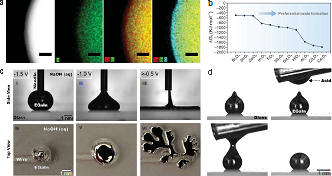 图2 EGaIn的氧化层特性。(a) EGaIn纳米粒子的TEM成像及元素映射。 (b) 不同金属表面形成氧化物的吉布斯自由能分布。(c) 在NaOH溶液中通过施加偏压来控制EGaIn表面氧化层的电化学形成。(d) 表面氧化层可以通过酸去除并改变EGaIn的形状。