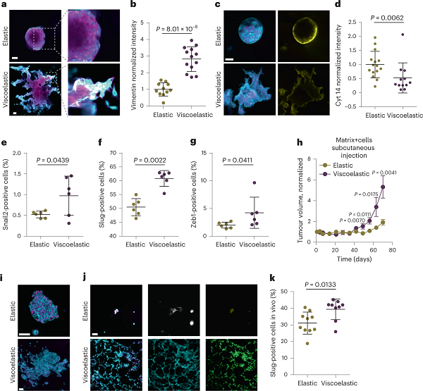 (j)植入7天后,裸鼠体内的粘弹性和弹性水凝胶中MCF10A球体的蝴蝶兰素和Hoechst(左)、线粒体(中)和波形蛋白(右)染色的代表性实例。