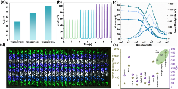 根据麦克斯韦理论,输出功率与摩擦电荷密度的平方成正比,接触产生的摩擦电子与静电感应耦合产生的摩擦电子产生的位移电流决定了TENG的输出性能。增加摩擦表面电荷密度的能力对于提高相应的性能很重要,而合理设计构件是提高摩擦电材料电荷密度的最有效方法。近年来的研究表明,削弱金属节点的离子耦合,增加有机桥接配体的静态感应效应是进一步提高其摩擦电性能和电流输出性能的有效策略。如果在摩擦电材料设计中引入离子配体,不仅可以有效提高电荷分离程度,而且在配位键形成过程中充分保留质子和电子载流子,为摩擦电子的产生和传输提供便利条件。