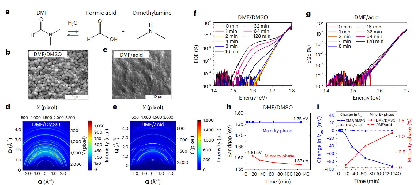 图1. 氢卤酸对FA0.83Cs0.17Pb(I0.6Br0.4)3薄膜形貌、晶粒质量和电子无序性的影响。(a) DMF分解成二甲基铵和甲酸。(b, c) 以DMF/DMSO为溶剂制备的钙钛矿薄膜和以DMF/acid制备的钙钛矿薄膜的照片。(d, e) 沉积在FTO基底上的钙钛矿薄膜的广角X射线散射。(f, g) 由傅里叶变换光电流光谱得到的以DMF/DMSO为溶剂的和DMF/acid制备的钙钛矿薄膜的EQE。(h) 混合钙钛矿薄膜中主相和高碘次相的禁带宽度。(i) 不同辐照时间后相分离的程度及其引起的Voc损失 ©The Author(s)