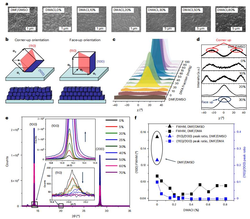 图3. 不同DMACl添加量对FA0.83Cs0.17Pb(I0.6Br0.4)3钙钛矿薄膜晶粒质量、取向和电子无序性的影响。(a) 不同DMACl添加量下钙钛矿薄膜的SEM照片。(b) 相对基底不同取向的晶粒的示意图。(c) 不同DMACl添加量的钙钛矿薄膜的二维X射线衍射图谱。(d) 不同DMACl添加量的钙钛矿薄膜(100) 晶面二维X射线衍射强度。(e) 经退火后的不同DMACl添加量的钙钛矿薄膜的一维X射线衍射图谱 (f) (100) 晶面对应的衍射峰的半峰高宽 ©The Author(s)