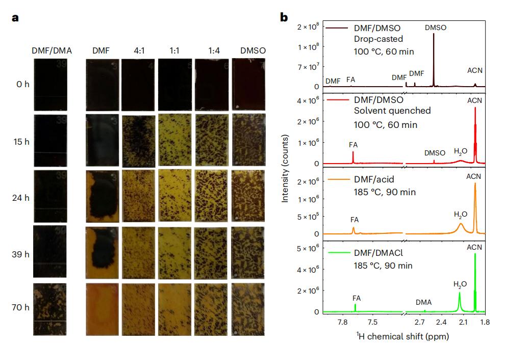 图4. 溶剂和制备方法对薄膜抗湿性的影响。(a) 85%湿度下不同方法制备的薄膜的照片。(b) 不同薄膜的1H NMR谱图 ©The Author(s)