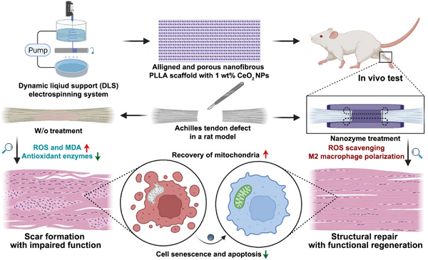 上海交通大学附属第六人民医院范存义教授、Qian Yun、欧阳元明博士等人发明一种将酶模拟纳米二氧化铈纳米酶(CeNPs)结合到纳米纤维束支架中的智能支架(NBS@CeO),其具有多孔、各向异性和增强的机械性能,旨在通过挽救线粒体功能和重塑有利于内源性再生的微环境,创新性地探索有针对性的能量支持修复策略。整合的CeNPs清除过多的活性氧(ROS),稳定线粒体膜电位(ΔΨm),以及在氧化应激下肌腱衍生干细胞(TDSC)的ATP合成。在大鼠跟腱缺损模型中,NBS@CeO减少氧化损伤并加速胶原纤维的结构再生,表现为恢复机械性能和运动功能。此外NBS@CeO通过减轻TDSC的衰老和凋亡、下调衰老相关分泌表型(SASP)的分泌和诱导巨噬细胞M2极化,介导内源性再生信号和失调免疫微环境的再平衡。这一创新战略突出了NBS@CeO因此提供了促进肌腱再生的潜在治疗方法。相关研究成果以“Energy-Supporting Enzyme-Mimic Nanoscaffold Facilitates Tendon Regeneration Based on a Mitochondrial Protection and Microenvironment Remodeling Strategy”为题发表于Advanced Science上。