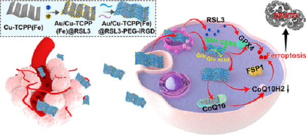 重庆大学蔡开勇教授和罗忠教授报道了一种基于Cu-TCPP(Fe)金属有机骨架(MOF)的纳米体系,并在其中高效掺入Au NPs和RSL3,最终用聚乙二醇(PEG)和iRGD修饰,用于肿瘤靶向药物递送。这些纳米催化活性可导致GPX4/GH和FSP1/CoQ10H2途径的同时抑制,并与RSL3的GPX4失活功能协同作用,导致明显增强的铁死亡,从而为临床应用铁死亡治疗提供了强有力的理论基础。相关研究成果以“Multienzyme-like Reactivity Cooperatively Impairs Glutathione Peroxidase 4 and Ferroptosis Suppressor Protein 1 Pathways in Triple-Negative Breast Cancer for Sensitized Ferroptosis Therapy”为题发表于ACS Nano上。