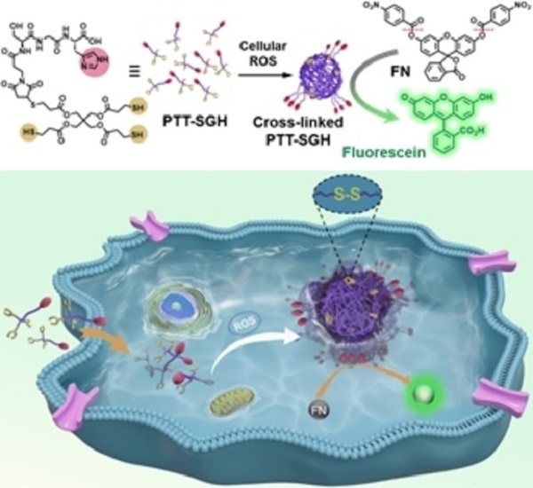 中国科学院化学研究所的王树研究员和黄一鸣研究员等人联合报道了细胞内ROS触发的人工酶组装用于启动催化活性和选择性肿瘤细胞成像。研究人员通过将催化组氨酸残基引入季戊四醇四(3-巯基丙酸酯)(PTT),获得了对活性氧(ROS)具有响应性的人工酶PTT-SGH。人工酶通过细胞内ROS介导的巯基氧化在细胞中形成大的聚集体。由于肿瘤微环境中的ROS浓度较高,肿瘤细胞中的这一过程显著促进。这种人工酶的催化活性通过交联PTT-SGH的去质子化而得到了增强,表现出典型的酯酶活性。使用人工酶触发活细胞内笼状荧光团的酯键断裂,实现肿瘤细胞的选择性荧光成像。相关研究成果以“Selective Fluorescence Imaging of Cancer Cells Based on ROS-Triggered Intracellular Cross-Linking of Artificial Enzyme”为题发表于Angew. Chem. Int. Ed.上。