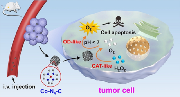 中国科学院国家纳米科学中心陈春英研究员、杨蓉研究员和蔡双飞副研究员共同研发了一种通过Co单原子纳米酶启动级联酶促反应进行肿瘤催化治疗的新策略。这种纳米酶由氮掺杂的多孔碳负载Co单原子(Co-SAs@NC)组成,有着比表面积大、高度分散的原子位点和Co-N配位结构等优势。在级联催化反应中,它首先发挥类似过氧化氢酶(CAT)活性,将肿瘤细胞内源性H2O2分解产生O2,随后表现类氧化酶(OD)活性,将O2还原成超氧阴离子(O2·-)自由基,引发肿瘤细胞凋亡。进一步与化疗药物(阿霉素)联用,显著增强了抗肿瘤效果。相关研究成果以“Tumor-Microenvironment- Responsive Cascade Reactions by a Cobalt-Single-Atom Nanozyme for Synergistic Nanocatalytic Chemotherapy”为题发表于Angew. Chem. Int. Ed.上。