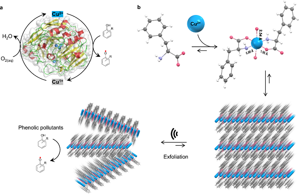 特拉维夫大学Ehud Gazit教授、加州大学河滨分校Bryan M. Wong教授、印度理工学院Pandeeswar Makam博士等人报告了一种简易但高度活跃和稳定的单氨基酸仿生酶,它可以催化环境中有毒的酚类污染物的快速氧化,并作为一种超灵敏的工具来检测类似于漆酶的重要生物神经递质。虽然受到漆酶催化部位的启发,但实质上更简单的铜配位仿生酶与天然蛋白质相比,成本效益高5400倍,效率高4倍,灵敏度高36倍。此外,所设计的模拟物在极端条件下(pH值、离子强度、温度、储存时间)是稳定的,可以明显地重复使用几个周期,并显示出广泛的底物特异性。这些发现为开发用于分析化学、环境保护和生物技术的高效仿生酶带来了巨大希望。相关研究成果以“Single amino acid bionanozyme for environmental remediation”为题发表于Nature Communications上。