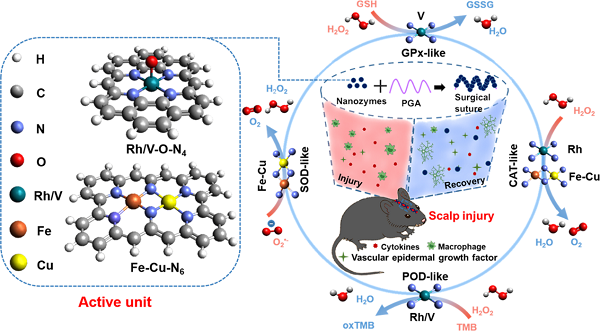 天津大学张晓东教授团队发现单原子纳米酶RhN4和VN4的超高生物催化活性,其催化反应亲和力超越天然酶5-20倍,并发现其具有X-O-N4的新型催化活性中心和双侧反应路径;同时克服了天然酶不稳定、易失活性的缺点,其生物催化稳定性能持续数月以上;可以通过调节巨噬细胞等免疫细胞,减少炎症,实现对神经创伤的高效缝合。该成果有望加速神经创伤的早期愈合。相关研究成果以“Single-atom nanozymes catalytically surpassing naturally occurring enzymes as sustained stitching for brain trauma”为题发表于Nature Communications上。
