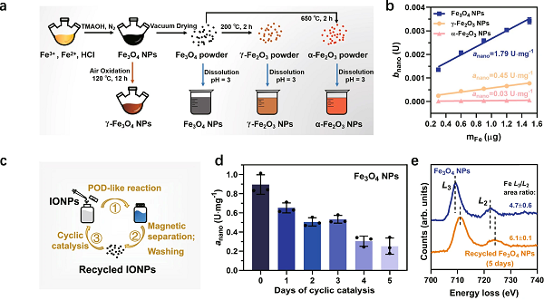 东南大学张宇研究员、顾宁院士、马明副研究员等人联合报道了Fe3O4中的Fe2+可以通过Fe2+-O-Fe3+链将电子转移到表面,使表面Fe2+再生,并实现持续的POD样催化反应。这个过程通常发生在过量氧化的Fe3+从晶格向外迁移的过程中,这是一个速率限制步骤。经过长时间的催化,Fe3O4纳米酶经历了向γ-Fe2O3的相变,具有可耗尽的POD样活性。具有参与电子转移和离子迁移的内部原子的纳米酶的这种自我消耗特性在磷酸铁锂纳米颗粒上得到了很好的验证。本研究揭示了一个被忽视的问题,即在设计、调节和应用纳米酶时,必须同时考虑表面和内部原子。相关研究成果以“Depletable peroxidase-like activity of Fe3O4 nanozymes accompanied with separate migration of electrons and iron ions”为题发表于Nature Communications上。