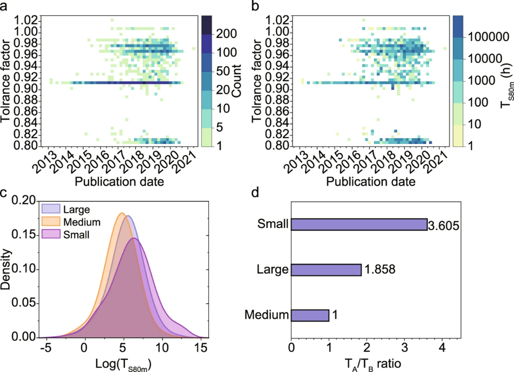 (b)数据库记录的器件最优稳定性(以TS80m值计)与容忍因子和文章发表日期相关的热图;