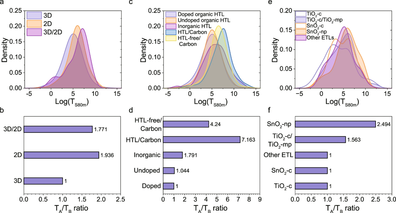 在此,南开大学电子信息与光学工程学院光电子薄膜器件与技术研究所罗景山教授团队对开放数据库Perovskite Database中超过7000组钙钛矿太阳能电池稳定性数据进行了统计分析,探究了不同钙钛矿组分、器件结构对器件稳定性的影响。基于此,他们提出了一个统一指标TS80m来描述钙钛矿太阳能电池的稳定性,该指标使不同环境测试条件下的稳定性结果标准化,从而能够直接比较不同的稳定性结果。这为实现更稳定的钙钛矿太阳能电池提供了重要见解,为钙钛矿太阳能电池领域的未来研究方向提供了合理建议。