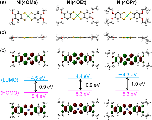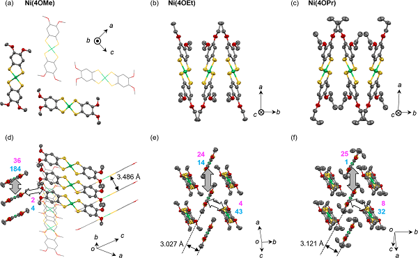 (a-b)Ni(4OMe)、Ni(4OEt)和Ni(4OPr)单晶的分子结构的顶视图和侧视图。