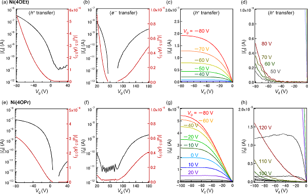 FET器件中制备的(a−d)Ni(4OEt)和(e−h)Ni(4OPr)薄膜的FET特性。
