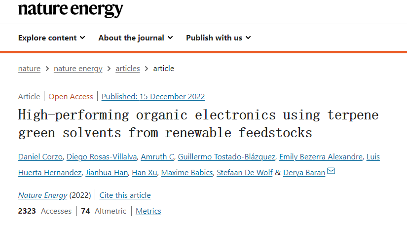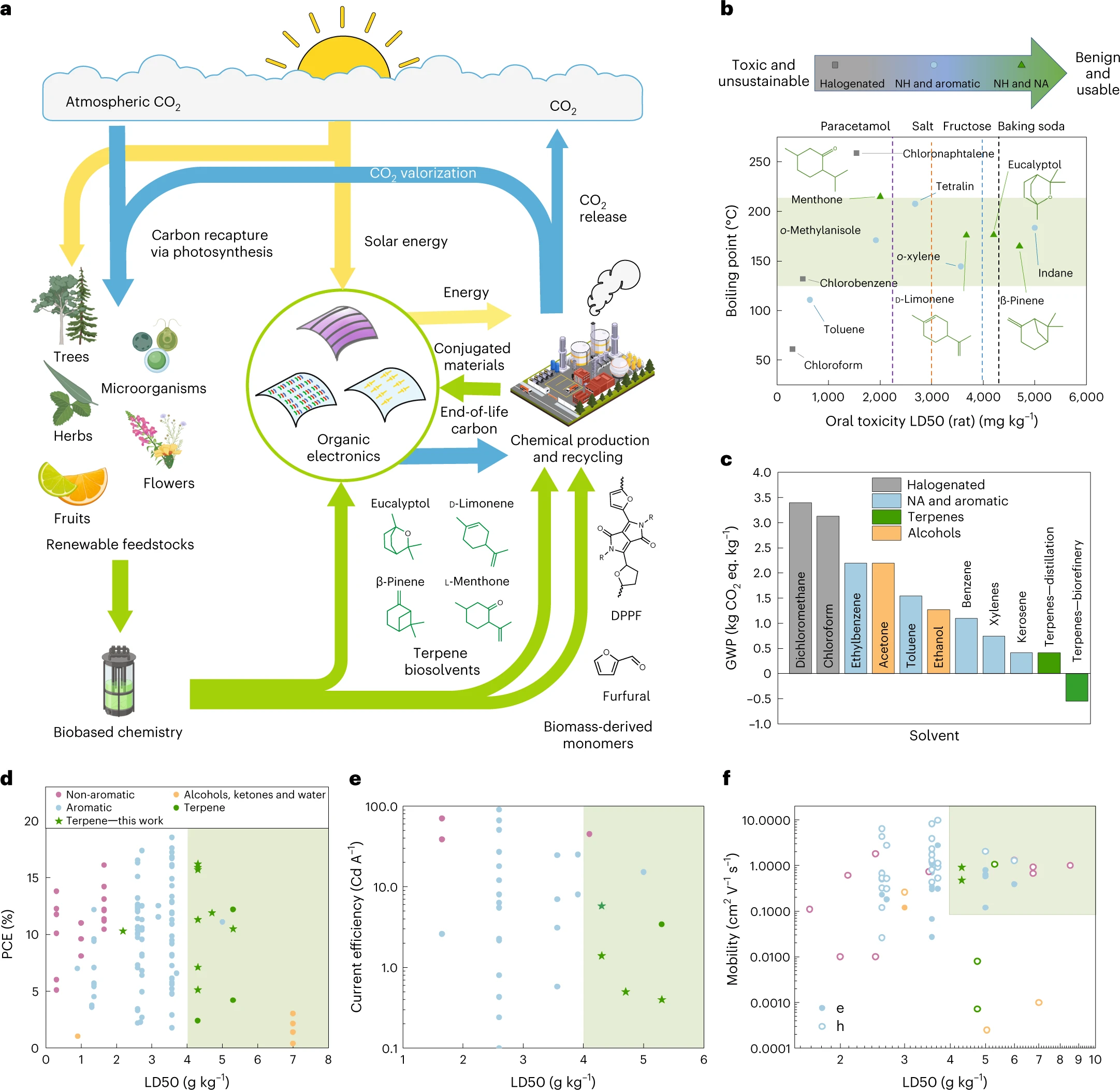原文详情: Corzo, D., Rosas-Villalva, D., C, A. et al. High-performing organic electronics using terpene green solvents from renewable feedstocks. Nat Energy (2022). https://doi.org/10.1038/s41560-022-01167-7。