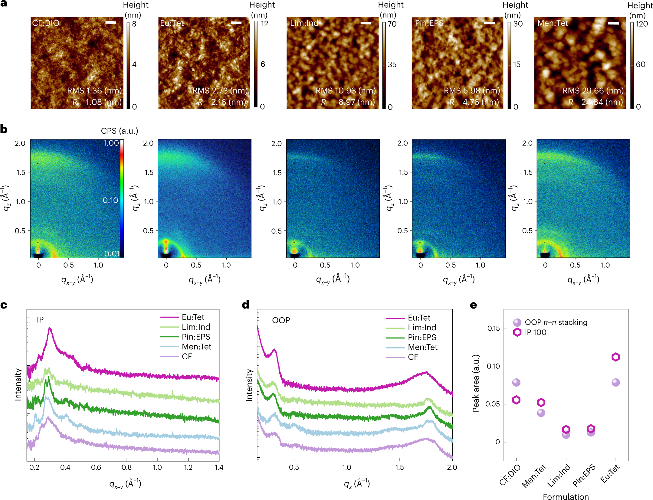 (a,b)不同萜烯配方和CF:DIO制备薄膜的AFM高度图像(a)和二维 GIWAXS图像(b)。