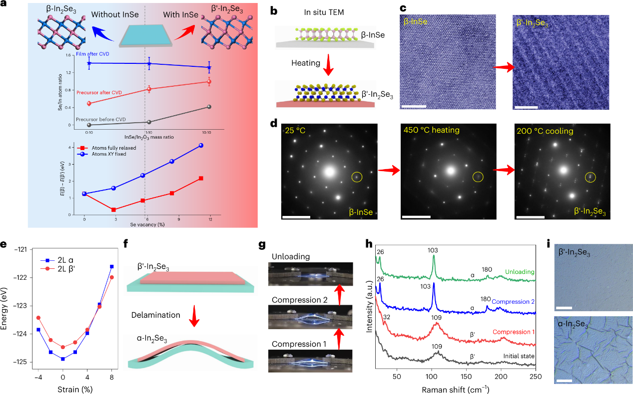 作者在图2a中通过能量色散X射线(EDS)光谱发现不同生长批次发现Se/In比例与前驱体In2O3和InSe的比例有直接关系。同时,作者还在图2a中通过DFT计算比较了不同Se空位浓度的单层β/β′相的基态能量。当所有的原子都完全松弛时,除了低硒空位浓度的状态(0-3%),β和β′相之间的能量差异随着硒空位的增加而单调地增加。如图2d所示,当β-InSe被加热到450℃时,SAED图案开始表现出微弱的卫星点,与室温下β-InSe的初始状态不同。在冷却到200℃后,又显示出β′-In2Se3晶体的形成。作者在图2e采用DFT计算来研究β′和α相在应变下的能量演变。β′相可以在~3%-8%的(拉伸)应变范围内转变为α相,反之亦然。另外,作者使用原位拉曼光谱在柔性PET基板上的样品(图2f,g)来验证应变诱导的相变机制。如图2h所示,在初始和压缩1状态下,In2Se3薄膜保持在β′相。当加载到具有较高曲率的压缩2状态时,In2Se3薄膜经历了从β′到α的突然相变,即使在去掉后仍保持α相。这种突然和不可逆的相变以及α- In2Se3薄膜中明显的皱纹揭示了薄膜分层和界面应变释放是这种相变的主要原因(图2i)。