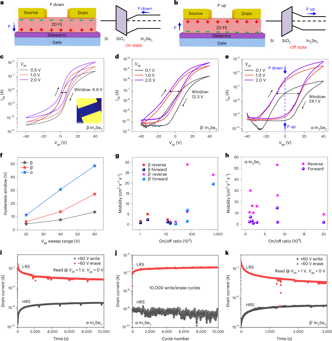 图3a,b中作者以这些二维半导体作为通道设计了FE-FET。向下的极化增加了FET通道中的载流子密度(图3a)。相反,向上的极化可以减少通道载流子密度(图3b)。利用栅极电压(Vgs)切换FE极化会造成滞后效应,并且在传输曲线上出现记忆窗口。如图3c所示,β-In2Se3器件的传输特性环显示在一个小的约6.9V滞后窗口。由于β- In2Se3是非铁电性的,这种小的滞后可能是由器件中的电荷捕获造成的。(图3g)表明由作者合成的二维β-In2Se3制成的场效应晶体管具有较高的电流开/关比率以及相当大的迁移率。同时,二维β′-In2Se3器件的转移特性环曲线显示出更宽的滞后窗口,更高的电流开/关比率和更高的迁移率(图3d,g)。最后,如图3e,h所示,二维α- In2Se3器件具有约24.1 V的超大磁滞窗和高达53.0 cm2 V-1 s-1的高迁移率,具有很高的电流开/关比率(约2×105)。这意味着得到的二维FE α- In2Se3薄膜是高性能计算和存储器件的潜在候选者。作者最后对α-和β′- In2Se3 NVM器件进行了保留时间和耐久性测量,结果显示α相的保留时间很长,循环稳定性更好(图3i-k)。