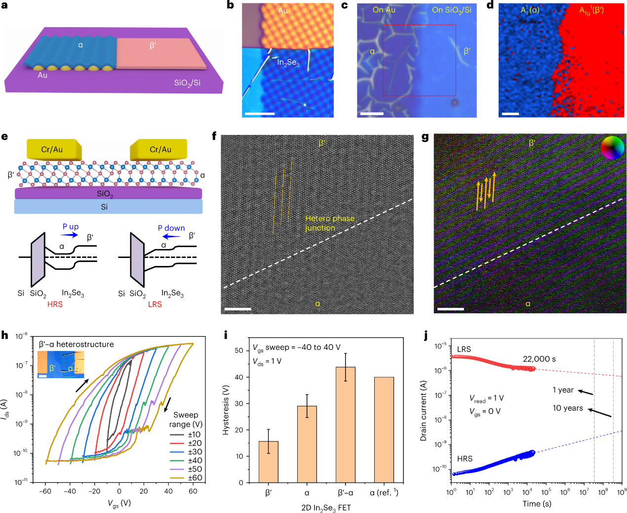 图4a,b中,作者通过应变进行相位控制之后,得到了α-β′面内异相结(α-β′结)。图4d中拉曼图谱结果显示两相合并的区域是均匀的。这意味着应变诱导的相变不仅可以用于大面积的二维α-In2Se3的制备,同时也是一种可控的异相连接的策略。如图4e所示,根据报道的α和β′相的电子结构,α-β′结的带状图形成II型带状排列。其工作机制是基于类似于单相场效应管的通断开关。图4f显示了STEM的α-β′结的原子结构,显示了由带有周期性条纹的β′相和没有条纹的α相连接的界面区域。在图4g中作者用差分相位对比STEM来测量相应的α-β′区域的内置电场和偏振映射。根据结果,整体电场从α相指向β′相,几乎垂直于界面。这种在α-β′异相交界处的可极化的内置电位场可以为器件提供更高的磁滞效应。图4h显示了不同栅极电压扫频范围的α-β′结器件的磁滞传递特性,磁滞记忆窗口随着栅极电压扫频范围的增加而逐渐增大。图4j展示了通过栅极电压控制对α-β′结器件进行的NVM保留测试,它显示了超过22,000秒的长保留时间和6000次循环的显著耐久性。因此,这种二维FE异相结中的高载流子迁移率和强大的NVM能力将为未来的内存逻辑器件开辟新的途径。