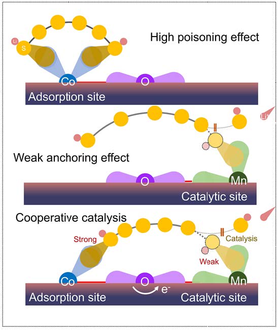 本研究在尖晶石型氧化物中构建的Mn3+Oh-O-Co3+Td协同位点,能够在催化剂表面临近位点上对LiPSs进行连续吸附-催化。这一方法通过在原子尺度上对活性位点的几何构型进行优化设计,实现了对电催化剂电荷、自旋、轨道构型等性质的调控,为LSBs多功能催化剂的研究提供了新思路。