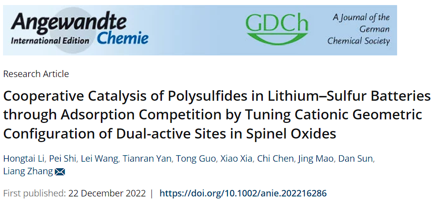 近日,苏州大学张亮教授课题组对尖晶石型氧化物进行了针对性设计,以Fe3O4为框架,先后引入Co3+和Mn3+,利用不同阳离子对不同位点的亲和性差异,选择性地将Co3+引入四面体位点(Co3+Td),Mn3+引入八面体位点(Mn3+Oh),成功构建了不对称的Mn3+Oh-O-Co3+Td结构。Mn3+Oh-O-Co3+Td结构中的超交换作用同时优化了Co3+Td和Mn3+Oh的电子结构,后续引入部分Se取代激活了整体的自旋电荷转移动力学。Co3+Td位点对LiPSs具有更强的吸附作用,Mn3+Oh位点能够有效实现LiPSs的催化转化,从而在原子尺度上实现了LiPSs在表面的连续吸附-催化过程。该研究成果以“Cooperative Catalysis of Polysulfides in Lithium-Sulfur Batteries through Adsorption Competition by Tuning Cationic Geometric Configuration of Dual-active Sites in Spinel Oxides”为题发表在知名期刊Angewandte Chemie International Edition上。